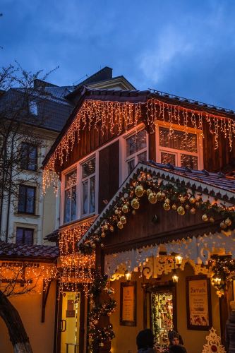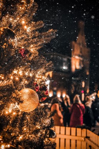 Cozy, warm-white rooflines and tree wraps